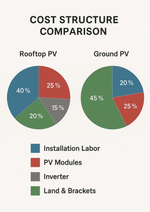 Le coût est un facteur important lorsque l’on compare ces deux systèmes. Les systèmes photovoltaïques sur toiture ont généralement des coûts d’utilisation du sol inférieurs puisqu’ils utilisent les structures des bâtiments existants. Cependant, la complexité de l'installation peut augmenter les dépenses si les toits ont des formes irrégulières ou nécessitent un renforcement. Les systèmes photovoltaïques au sol ont généralement des coûts initiaux plus élevés en raison de la préparation du terrain, de la construction des fondations et des structures de support. Néanmoins, les systèmes au sol permettent souvent des économies d’échelle, ce qui les rend rentables pour les grands projets. La décision globale d’investissement dépend des ressources foncières disponibles, de la production d’énergie attendue et du retour sur investissement à long terme.